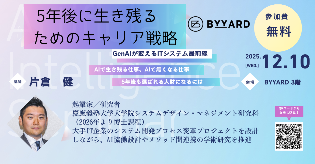 コードを書くのはAI、設計や判断を担うのは人間――そんな時代が、もう現実のものになっています。今回のセミナーでは、AI協働による開発プロセスの最前線に携わり、企業変革と研究の両軸で活動する 片倉 健(Ken Katakura)氏 をお招きします。AI時代における「設計」とは何か。そして、テクノロジーの進化に翻弄されるのではなく、AIとともに価値を生み出す人材として5年後に選ばれるための戦略とは?AIの進化を「脅威」ではなく「武器」に変えるためのヒントが詰まった内容です。AI時代をどう生き抜くかを考えるすべての方におすすめのセッションです。