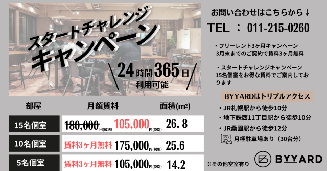 札幌シェアオフィスBYYARDへのお問い合わせはこちらから